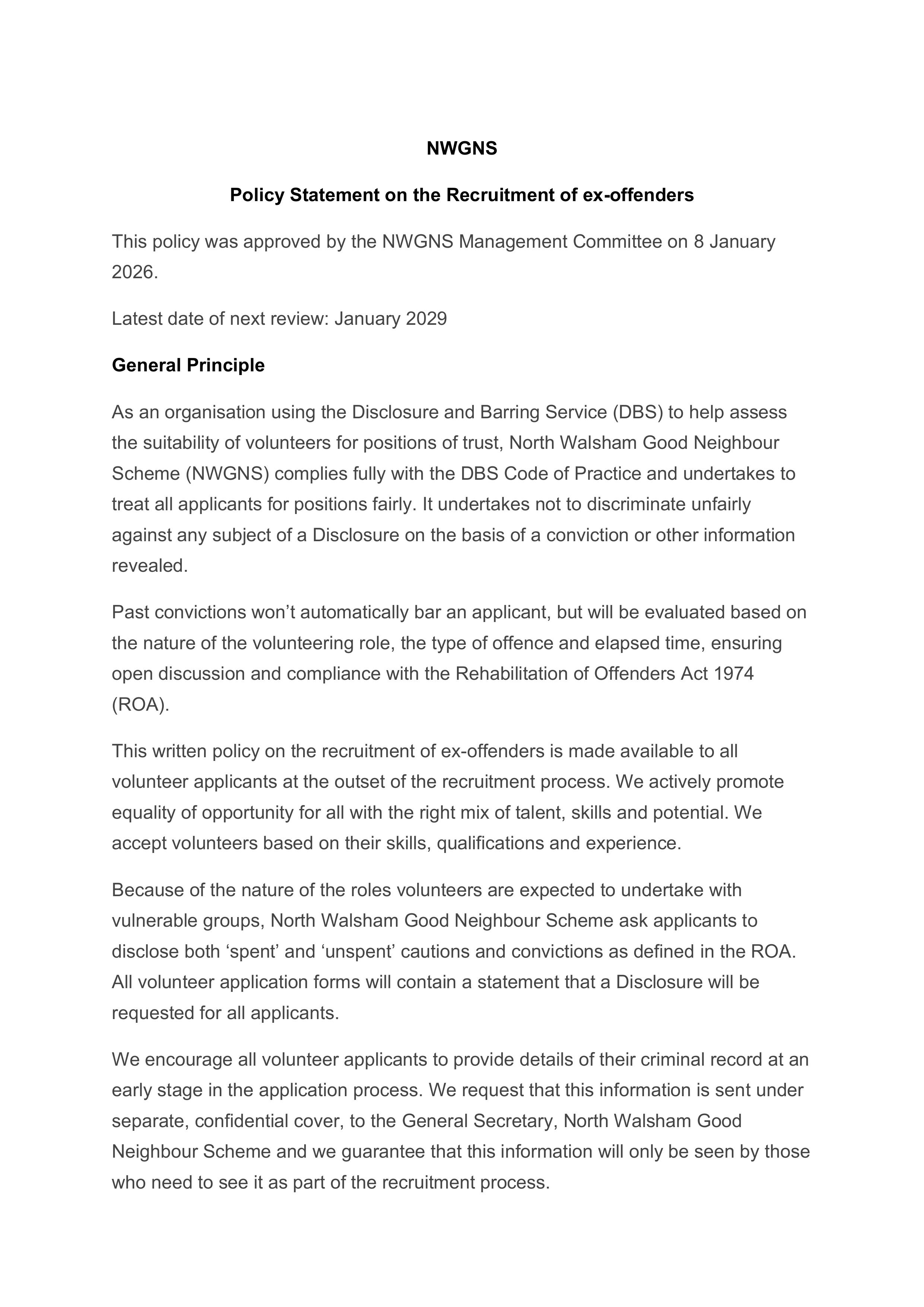 - As an organisation using the Disclosure and Barring Service (DBS) to help assess the suitability of volunteers for positions of trust, NWGNS complies fully with the DBS Code of Practice regarding the correct handling, use, storage, retention and disposal of Disclosures and Disclosure information.
